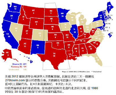 慣例是以藍色(民主黨的歐巴馬)、紅色(共和黨的羅姆尼)分別代表,可以視為『藍營』『紅營』的對決。